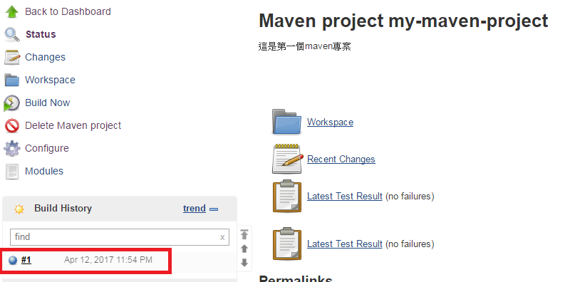 下圖表示建置已啟動 ,新增的build number 是 #2, 如下圖: